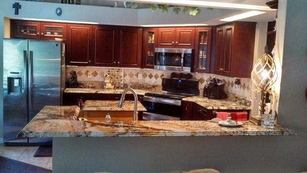 A kitchen upgrade done for Sherrie. The countertops are granite. There is a mobile food preparation island in the center.