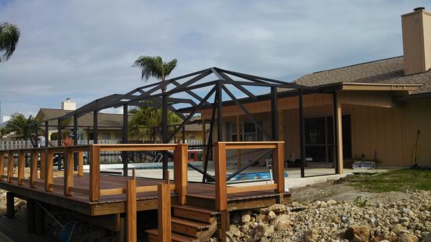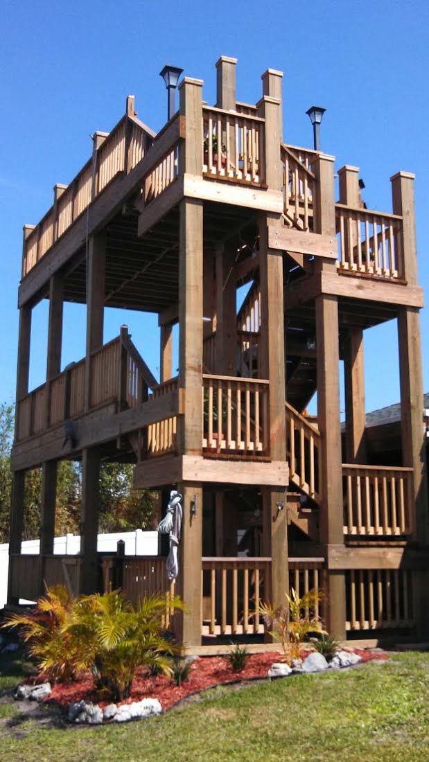 The Borsses' deck is supported on 32' pilings of 8"x8" pressure treated lumber. The top reaches 23' into the air. The pilings had to go 7' into the ground to support the deck properly. The deck measures 11'x25' and has 2 upper levels, all with a fun nautical theme.
