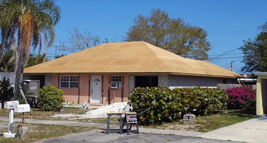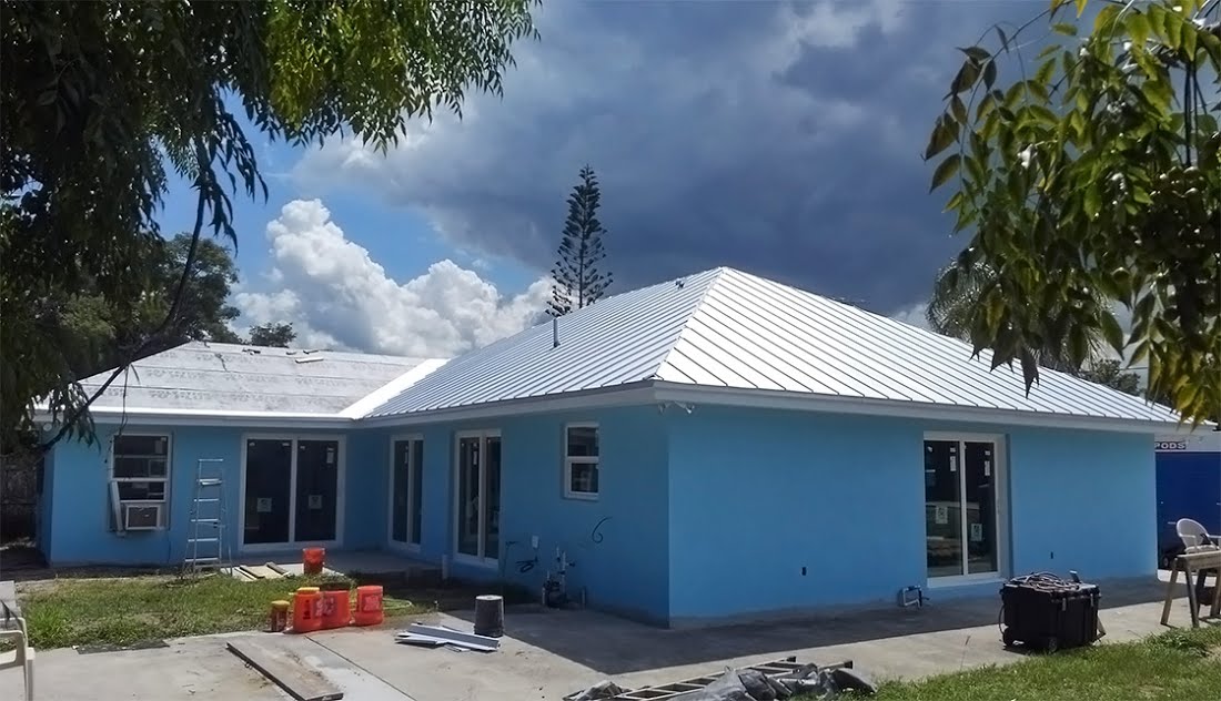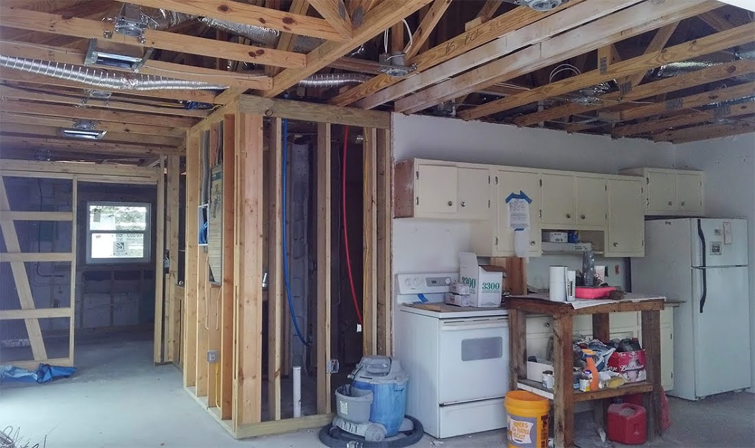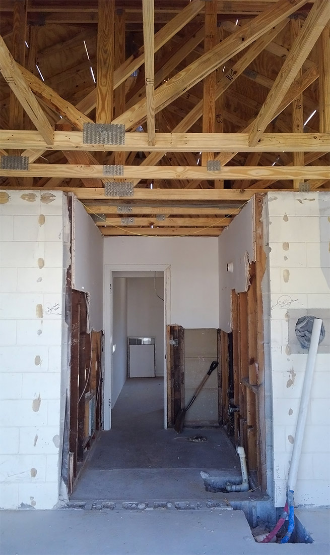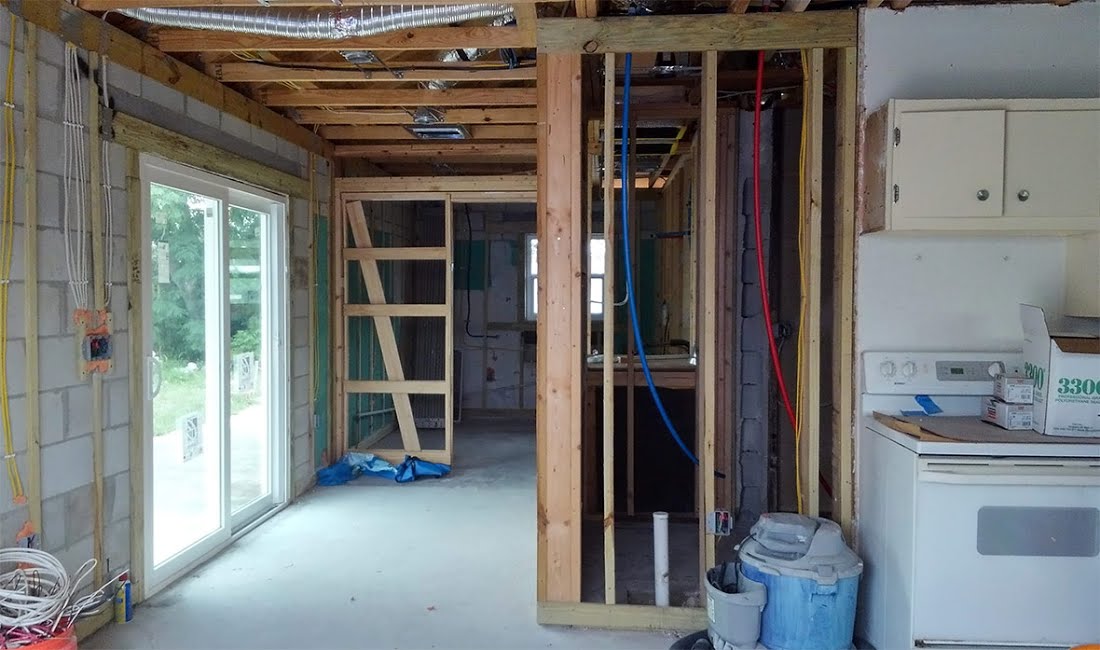The Schmidt residence: here is a view of the entire house renovation that was performed. The kitchen was enlarged into the existing carport, and around the corner is the framing for the new hall bath. At the far left is the laundry room.