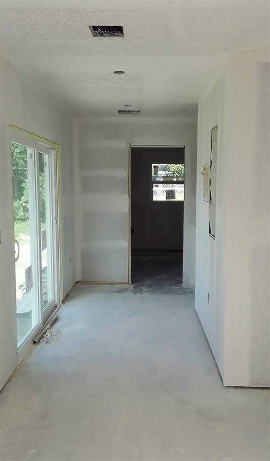 The Schmidt residence: the kitchen area looking back towards the laundry after the drywall was installed.
