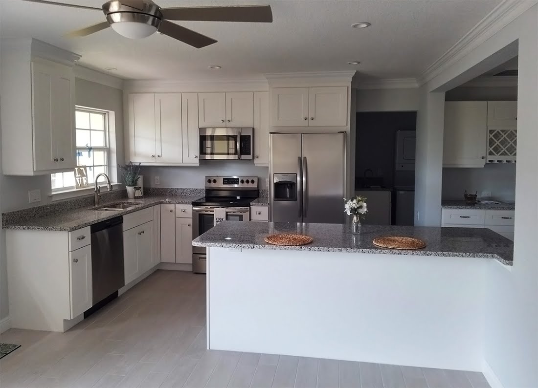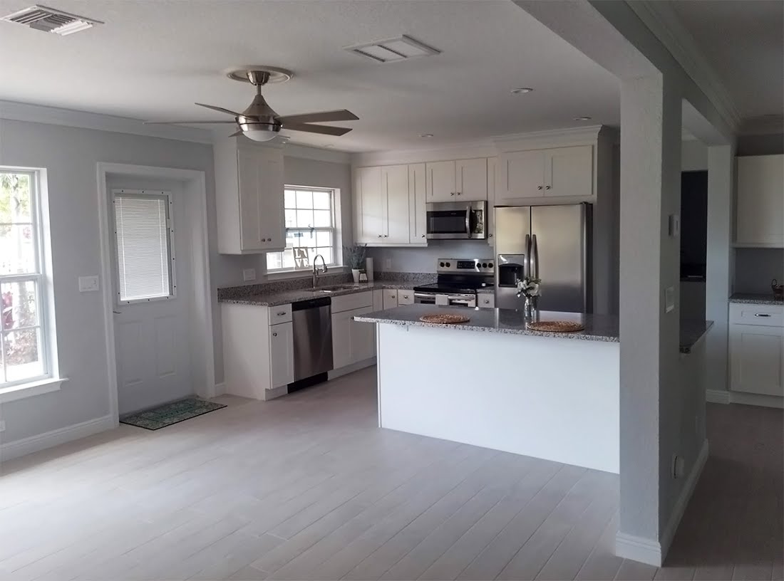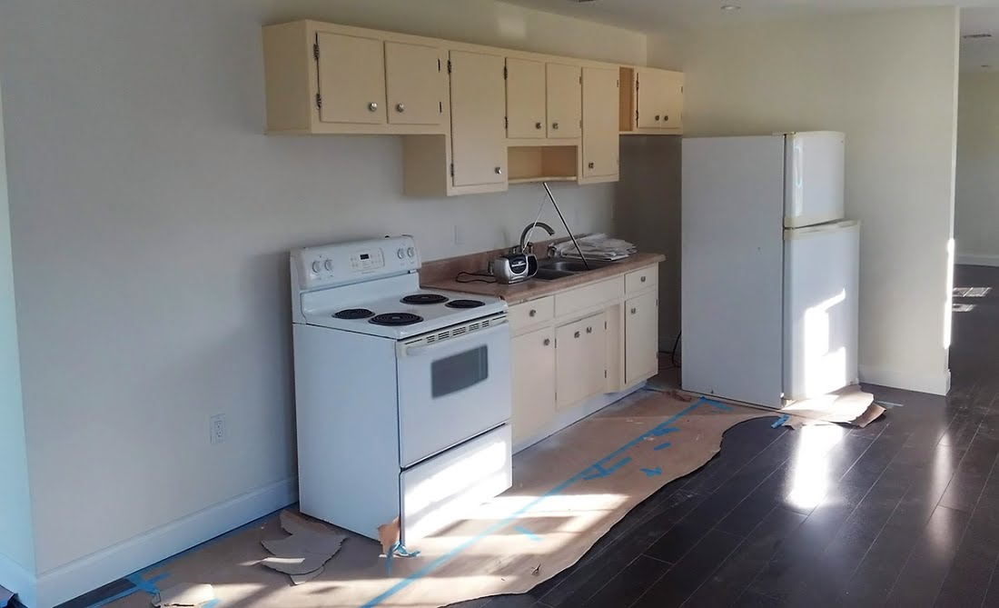 The Schmidt residence kitchen after plank flooring was installed. Ultimately the cabinets were repainted and retained.