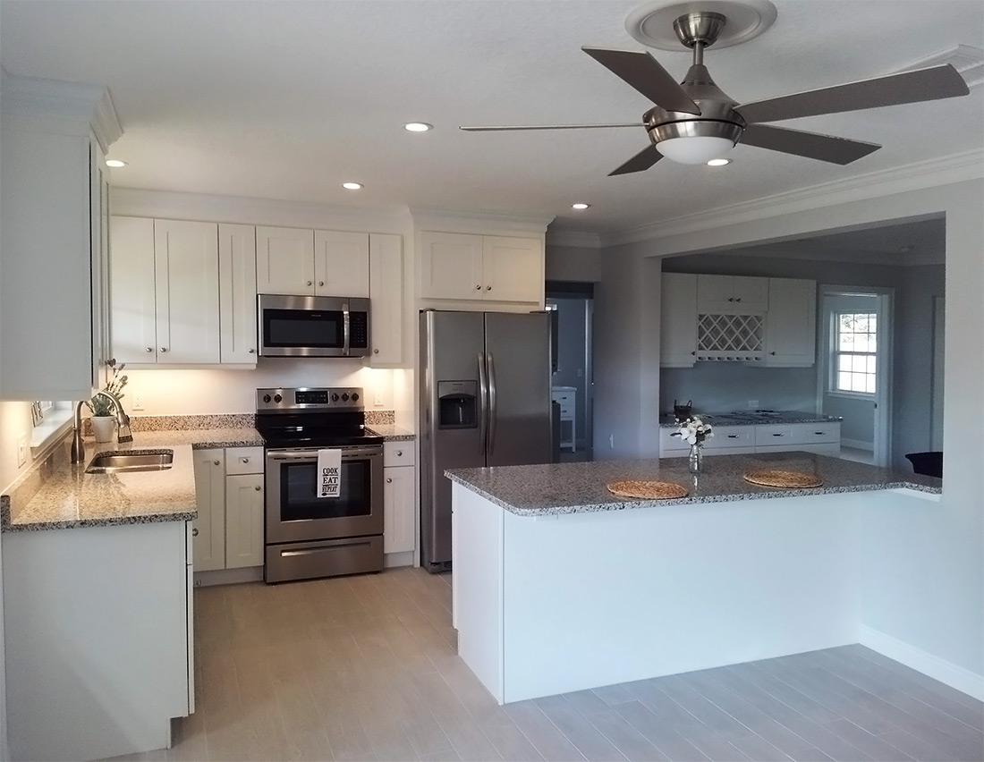 The Schmidt residence kitchen after plank flooring was installed. Ultimately the cabinets were repainted and retained.